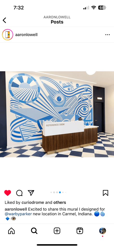 From the a lighthearted collaboration reel with Jimmy Fallon to a beautiful and funky mural by Aaron Lowell Denton at one of Warby Parker’s store locations in Carmel, Indiana, Warby Parker seeks to create a “persona” of sorts.