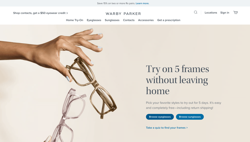 Screenshot of warbyparker.com home page