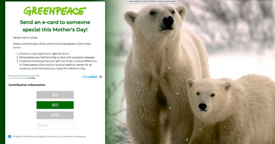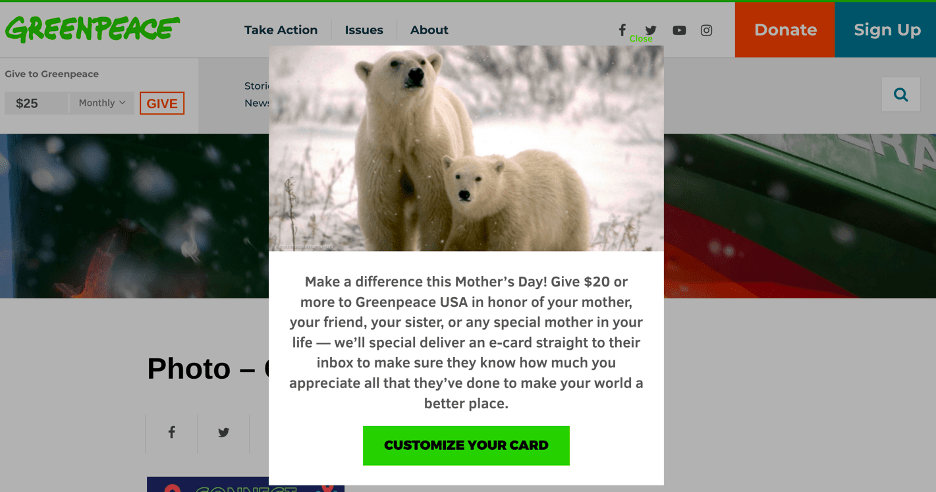 Take Greenpeace USA’s website for example. Immediately upon entering the website, a notification pops up asking if you would like to make a donation in honor of Mother’s Day.